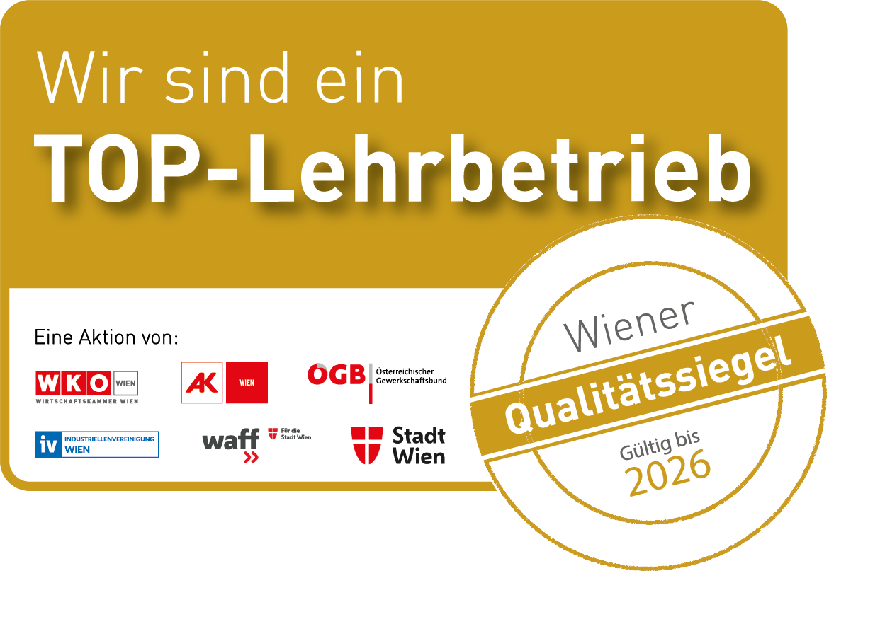 Wir haben Grund zu feiern: Wir wurden als Top-Lehrbetrieb ausgezeichnet und dürfen jetzt das Gütesiegel der Stadt Wien tragen. Darauf sind wir richtig stolz. Es zeigt, dass wir unseren Lehrlingen eine Ausbildung bieten, die überzeugt.
